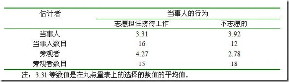 从你的研究结果中,对其加以统计处理,你可以发现,当事人更多地根据不同情况而作出不同的判断,不管当事人是否愿意志愿接待代表团,她们在游说基金方面的愿意程度都差不多,甚至原来不愿意接待的,而更愿意游说基金。旁观者则更多地根据当事人在前一件事情的表现上做出判断,将当事人的原先的决定看作是她的稳定品质的表现。因此,在旁观者眼中,愿意担任接待工作的,也往往愿意游说基金;其他则与之相反。