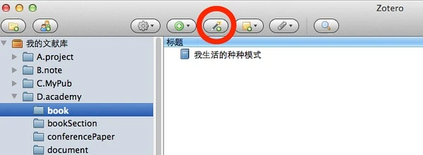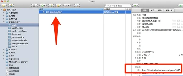 更有趣的是,我生活的种种模式这本书的豆瓣网址直接保存下来了,下次直接点击即可。这就是Zotero极其强大的Web Translators 功能,它可以根据世界上主要的信息资讯网站,生成相应的图标,比如,豆瓣的图书就是图书的小符号,维基百科则是维基类的小图标。更强大的是,一切你想保存资讯的网站,你可以定制Web Translators,然后保存在之前我们创建的根目录: