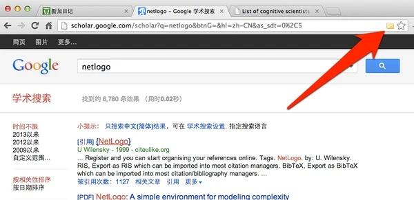 一次一次导入一篇,并不是学术研究时的常见现象。更常见的是,批量导入多篇。让我们以Google学术库为例。打开Google学术库,我们输入检索关键词,netlogo,一个网络仿真常用软件。