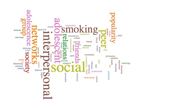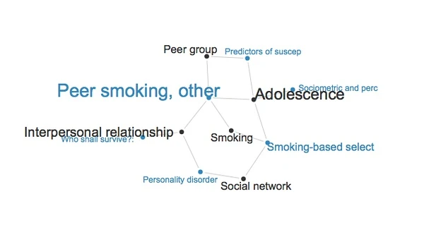 我们可以清晰地发现,我同事的学位论文中,引用的文献聚焦在:青少年吸烟、社会网络、同辈群体、关系等主题上。