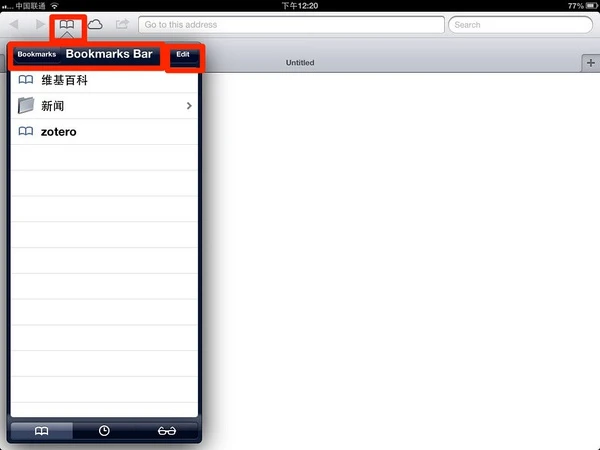步骤3,打开iPad的Safari,然后触摸书签,再触摸【书签栏】,如下图所示: