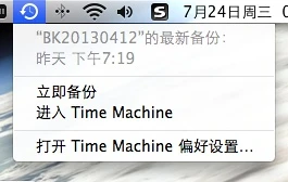 接上设置好的移动硬盘,它也会自动备份。备份进展,在右上角的菜单栏查看。
