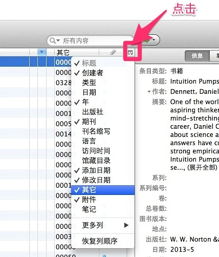 1、假设在Zotero中,我们的鼠标正选中了丹尼特这本书的条目。