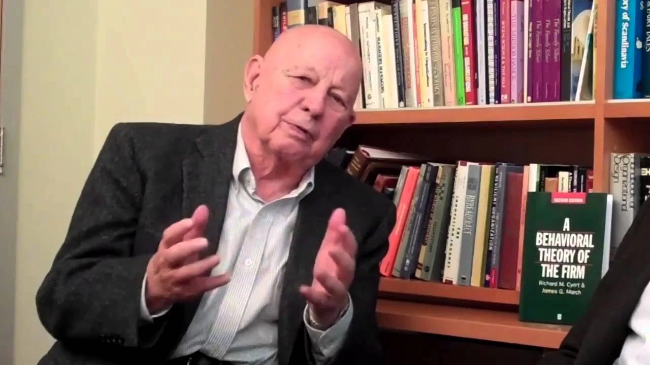 题图:斯坦福教授马奇(March)被称之为“大师中的大师”,成名极早,三十岁时即与诺贝尔奖、图灵奖双得主司马贺两人一块编写《组织》,开创组织研究的卡内基学派。题图为在一次对他的采访视频中摘取出来的。