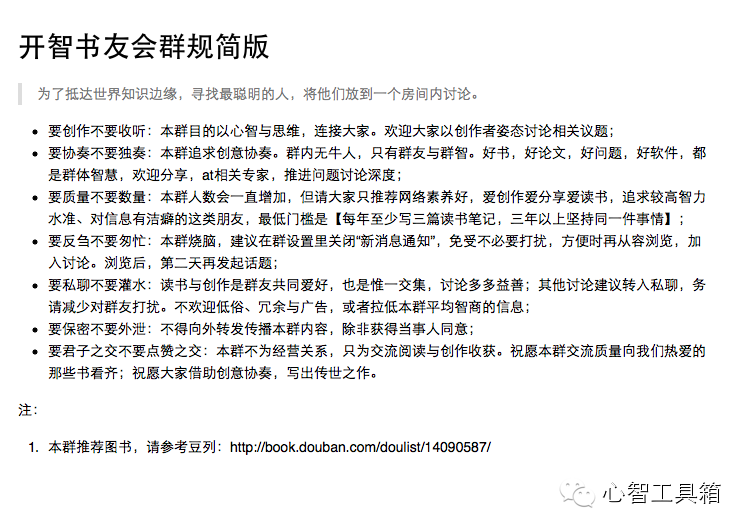 据说这是一个博士过百,群贤毕至,每周都在进行热烈且新鲜讲座的微信群。每次讲座都达到出书水准了。书单扩张很快:http://t.cn/R79thZY