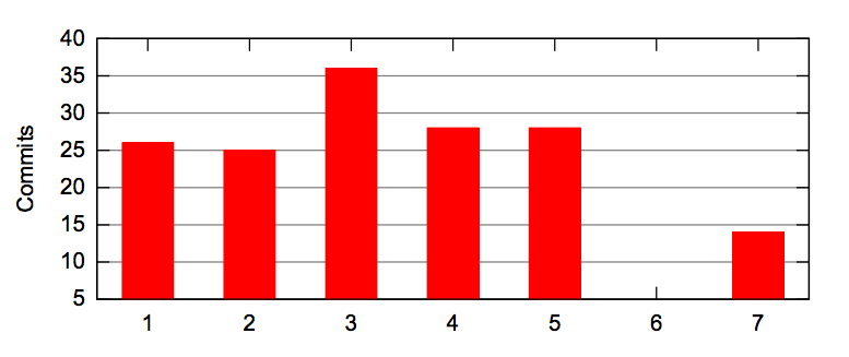 Github 伟大的地方是,它可以记录人们的学习与创作轨迹了。我的创作自从2011年以来,几乎都托管在Github。因此,分析我的时间,可以调用 Github 的 commit 数据,更清晰地感知。比如,这是我2011年某月的 commit 的频率与分布。
