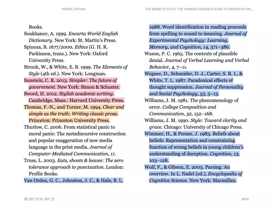 因此,建议大家阅读 the sense of style 一书时,尽量参照平克反复征引的文献,再重读正文,收获会更大。我精读这类著作时,会做一个工作,将作者征引的文献按学科,年代,引用频次分类。这个精读技巧对我个人帮助较大,尤其是阅读一些较难阅读的读物。感兴趣的朋友,也可以试试看。