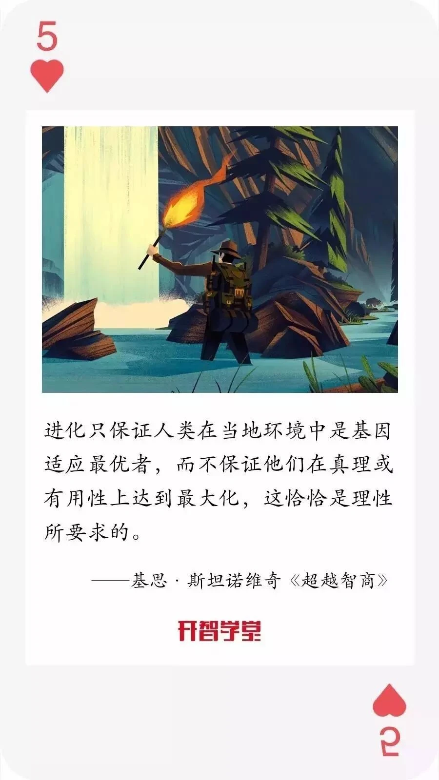 ps:从本周开始,我计划已久的主题学习尝试启动了。每周,带着几位心智学徒,一起读一些一手经典好书。第一周的主题是:理性思维。昨天在开智学堂发了对斯坦诺维奇的采访:http://t.cn/R5edVUd ;今天发的是芒格的演讲:http://t.cn/R5DnnVG 。都是我很喜欢的好文,顺手推荐。当然,我更喜欢这张扑克牌。