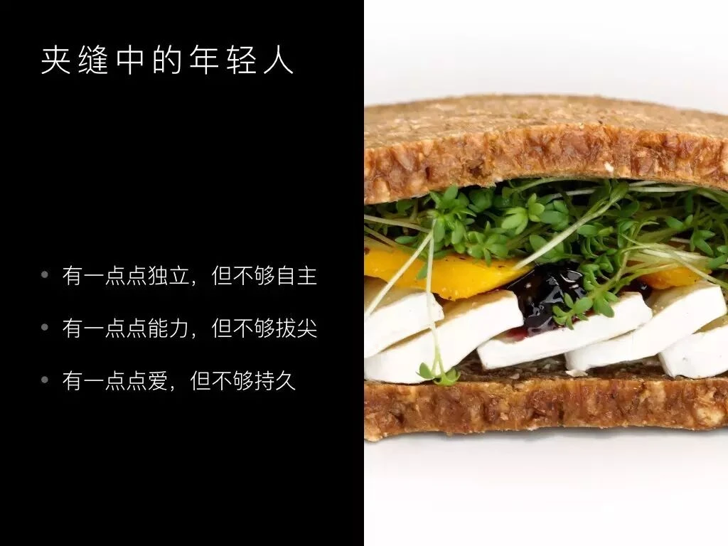 对于都市中24岁到36岁之间的年轻人来说,他们就像生活在夹缝中,有一点点独立,但不够自主;有一点点能力,但不够拔尖;有一点点爱,但不够持久。前些年有人将这些夹缝中的年轻人称之为「三明治」一族。这些三明治青年面临着方方面面的压力,工作、情感、家庭与人生意义的寻求。