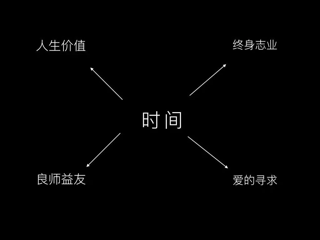 在时间维度上,人生价值和终身志业的困惑是怎样的呢?第一个常见的时间观误区在于,你希望在很短的时间内一下子四样都拿到手。如果想在三个月内既找到男女朋友,又找到终身志业,还认识一大堆朋友与发现人生价值,你会面临心力、时间的密集冲突。