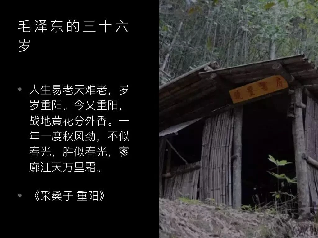 毛泽东的诗词以豪迈著称,类似人生易老这类感叹不多。这一年,36 岁的毛泽东是个什么状况?这一年正值他在政治上被边缘化,没有话语权;在身体上,大病小病不断,差点死于疟疾。不得不长时间住在一个茅草屋里养病。在后来者看来,伟人就应该激情澎拜,永远前进,始终积极。然而,这一年的毛泽东并不是。他时不时像一个普通人一样,想念远方家人;哀叹自身处境。