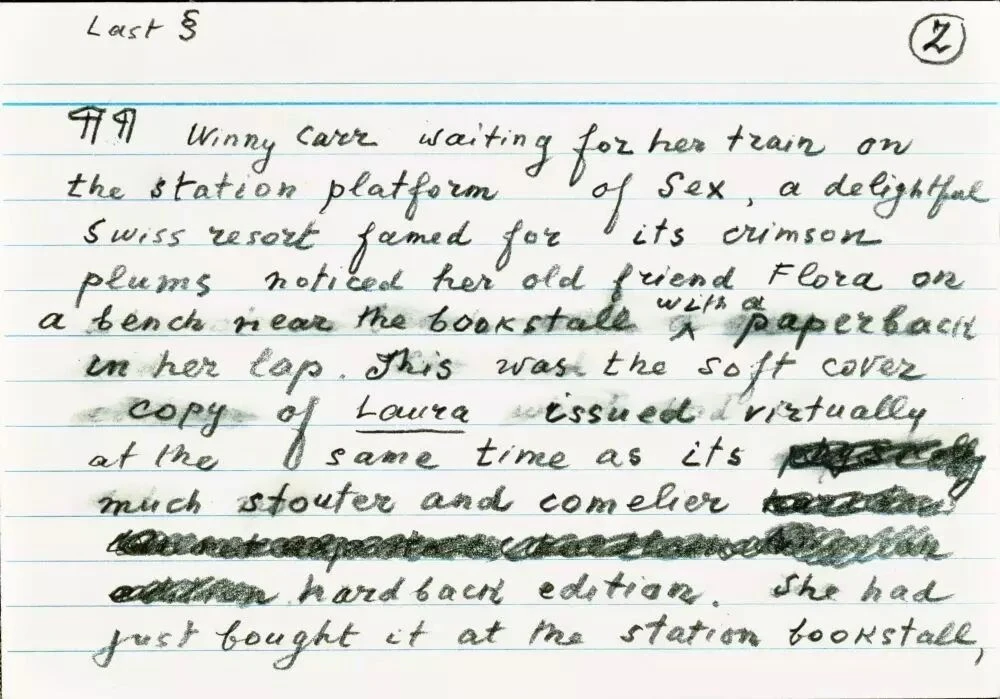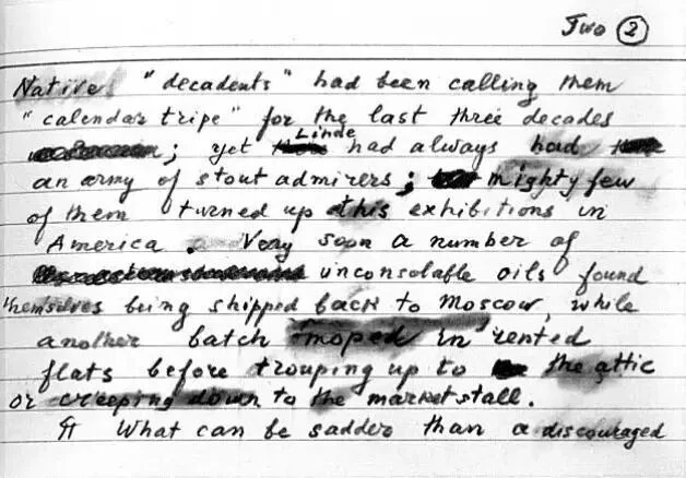 纳博科夫:作品的构思先于作品本身。就像玩字谜游戏,我随意在空白处填写。我在卡片上写下这些段落,直到完成整部小说,我的写作计划是灵活的,但我对写作工具则相对讲究:横格的布里斯托卡片、削得不太尖的橡皮铅笔。