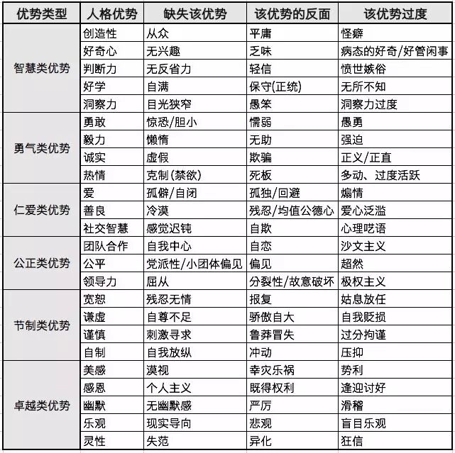 创造:隶属于智慧类美德,缺失该人格优势,导致「从众」;该人格优势反面是「平庸」;该优势过度导致「怪癖」。