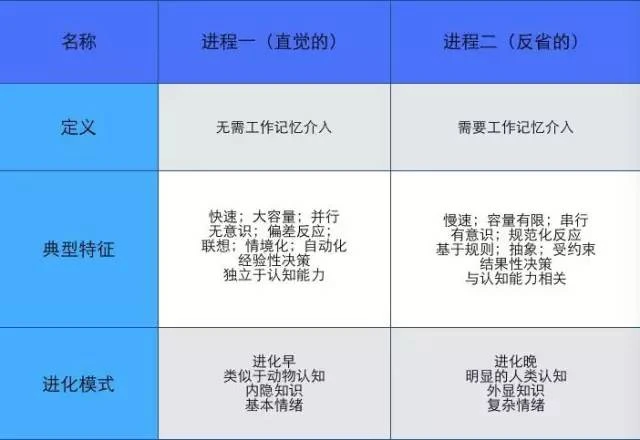 结果,心智程序(Mindware)概念反过来启发斯坦诺维奇提出人类心智架构的「双过程理论」。他与英国认知科学家埃文斯(Evans)审查了大量认知科学、神经科学与心理科学文献,注意到,无论是齐瓦孔达在社会心理学领域提出的冷认知、暖认知;还是雷伯在教育心理学领域提出的内隐学习、外显学习;还是埃文斯在推理心理学领域提出的进程 1、进程 2,都在阐述人类大脑的运作可以区分为两种不同认知过程。