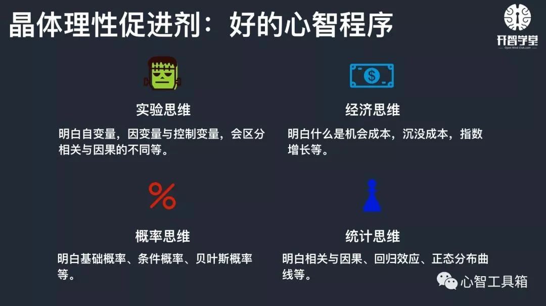 在课程中,我总结了来自实验心理学与临床医学、经济学、统计学、概率学四个关键学科的知识要点,将其称之为实验思维、经济思维、统计思维、概率思维。