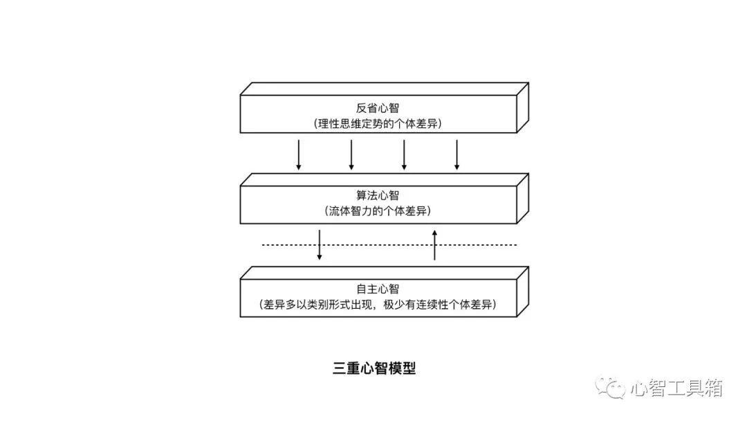算法心智则是传统智商测验考察的那些,比如反应快、算得准。反省心智则是指人类对自主心智、算法心智监控、调节的机制。
