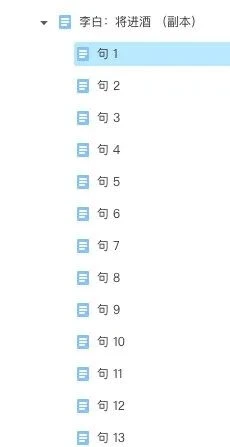 按照句子拆分,会将当前卡片中的任意文本,以句子为单位,拆分成卡片,并自动编号。它很合适拆分诗歌、导入的大纲类卡片。比如,我们拆分李白的《将进酒》,效果如下: