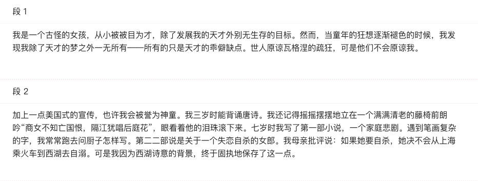 按照段落拆分,会将当前卡片中的任意文本,以段落为单位,拆分为卡片,并自动编号。它很合适导入的epub格式、Docx格式类文本。比如,我们拆分张爱玲的《天才梦》,效果如下: