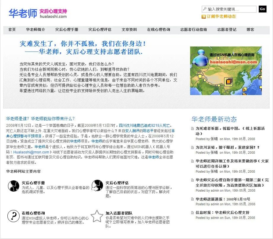当天晚上,我发起了一个灾后心理自助组织,召集了数千心理学志愿者,参与汶川灾后心理重建工作。我在 7 天内组织出版一本图书《灾后心理自助手册》,并捐赠四川灾区 7 万册,以及开发了在线心理咨询机器人、提供线上线下心理咨询服务等等。