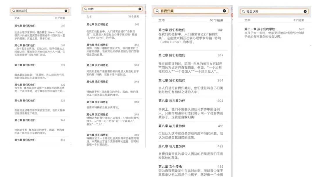 6、不少读者,没有注意到,《教养的迷思》出现塔杰菲尔(我一般翻译为泰费尔,欧洲社会心理学奠基者、社会认同论提出者)10 次、特纳(泰费尔学生,在他的社会认同论基础上发展了自我归类论,他著名的书就是《自我归类论》)15 次;出现「社会认同」1 次、「自我归类」16 次。如下图所示: