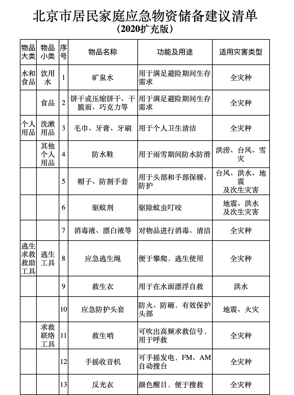 9、相对 2014 年的旧版来说,2020 年的新版多了一列:「适应灾种」。其中基础版的清单,建议大家在家里、车上常备,各一份。包里常备救生哨与逃生绳即可,适应全灾种。
