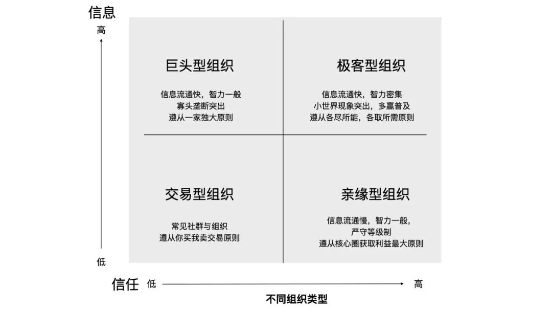 亲缘型组织。同处于低信息领域,亲缘型组织与交易型组织又不同,它要求极高的信任。它们严守等级制,遵循核心圈获取利益最大原则。典型的如中国各类商会。商会小圈子虽然信息流速低,但价值高,你在其他地方很难获取。