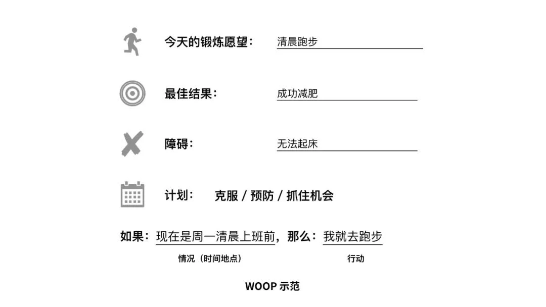 格尔维茨将“我要减肥十斤”这种制定计划的方式称之为“目标意图”,他强迫自己的实验对象使用一种“执行意图”的目标制定方式。什么是执行意图?它就是使用“如果……那么……”的句式来设定目标。比如: