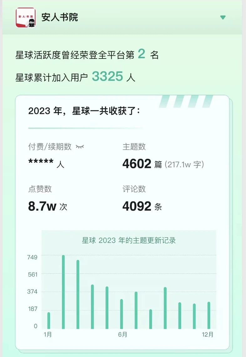 去年我的读书笔记,多数随手发在我的知识星球安人书院上。外加其他心得,全年撰写 7304 条,总计 40 万字。